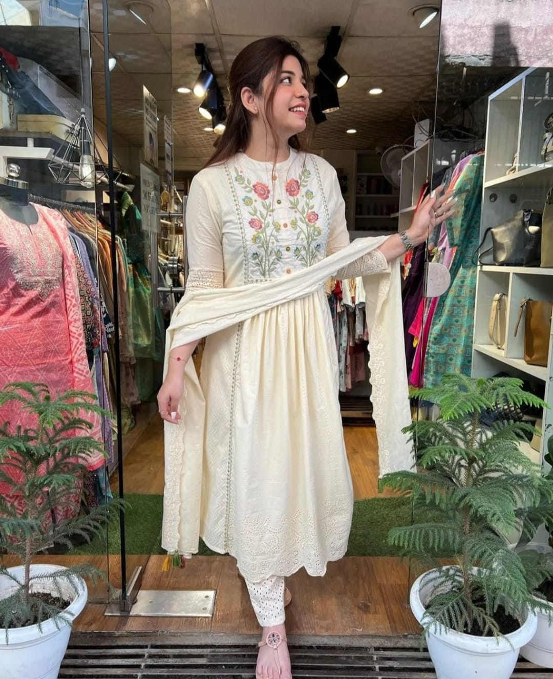 Chikan Floral Work Yoke Cotton Kurti Pant Dupatta Set
